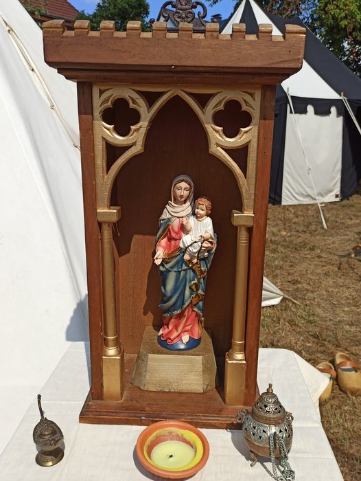 Das ist die vorläufig letzte Version unseres Altars mit dem bewehrten, gotischen Haus und der mit Blattgold besetzten Marienfigur. Seit der Saison 2023 hat der Altar ein eigenes Zelt bekommen.