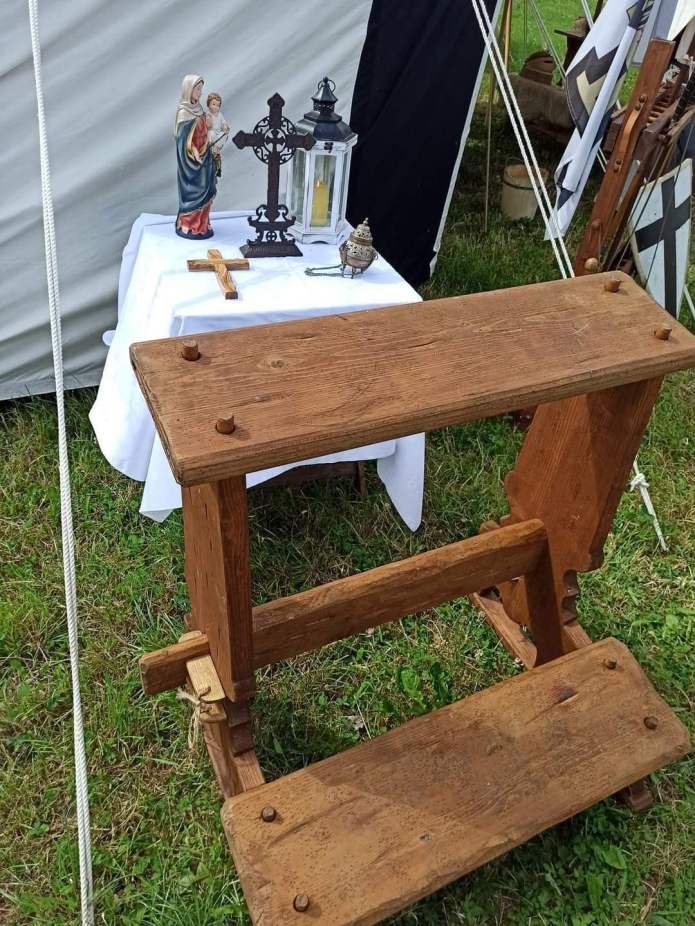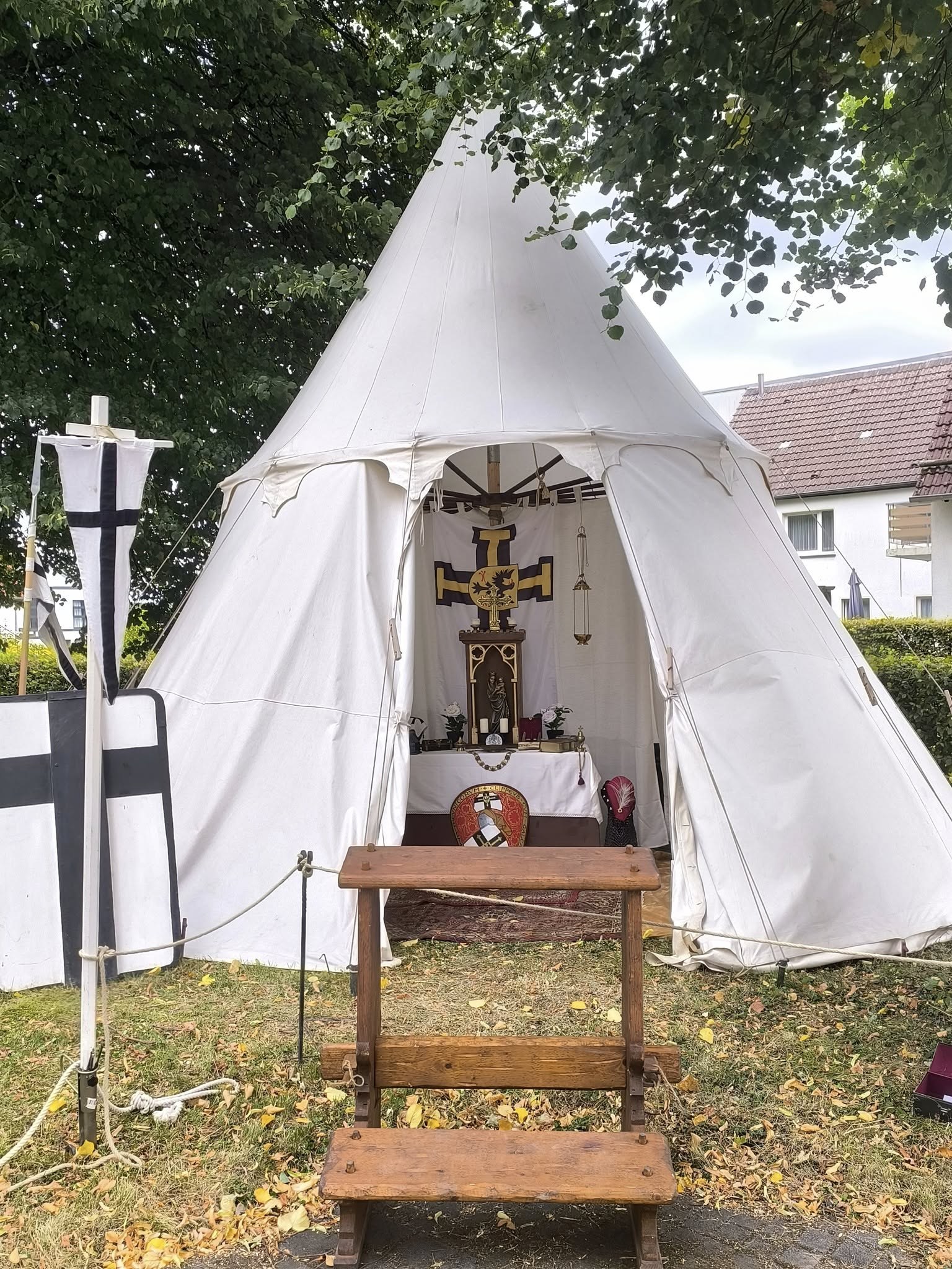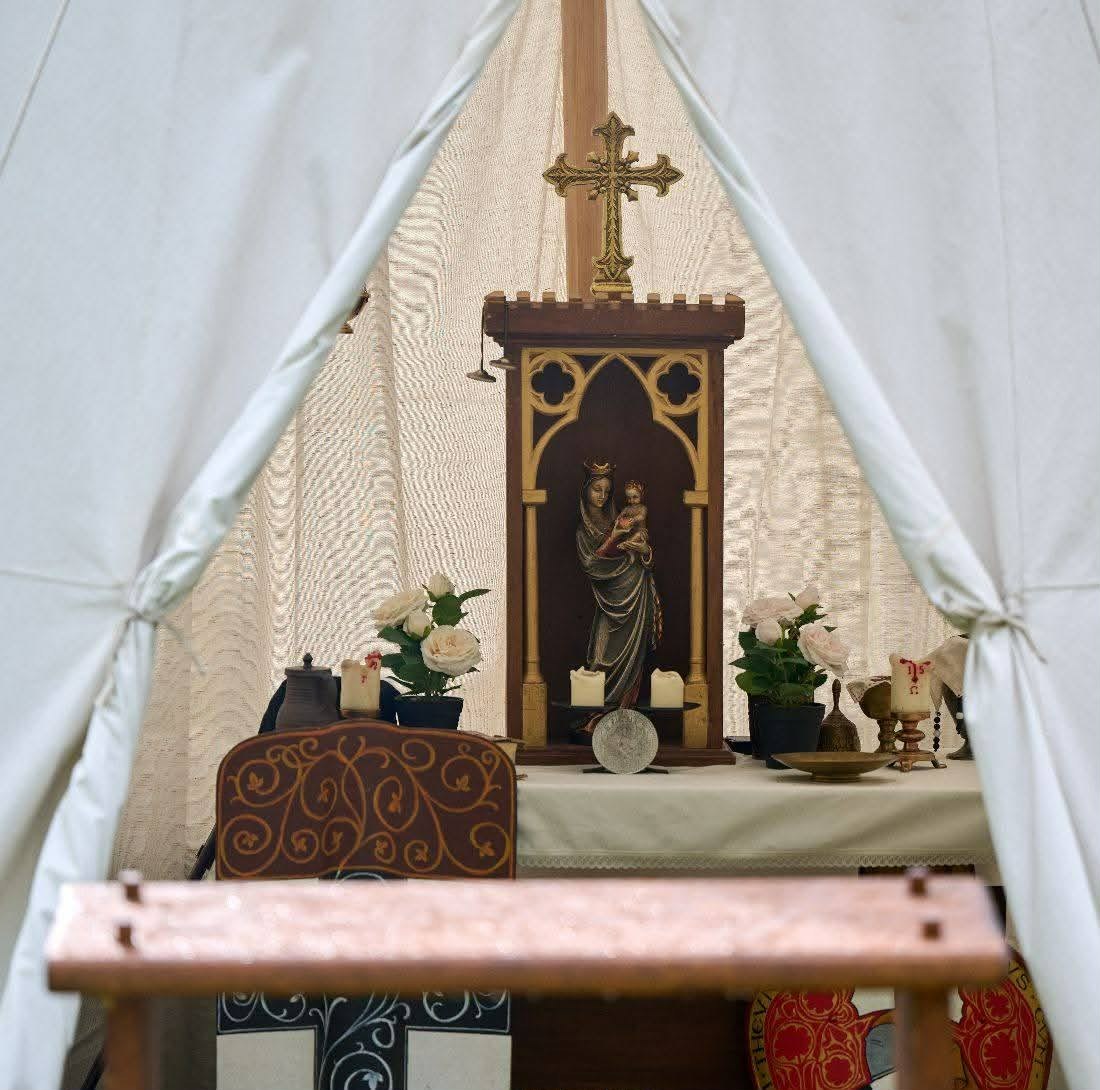 Das Kirchenzelt ist unser größtes Speichenradzelt. Innerhalb des Kirchenzelts findet man unseren Feldaltar. Neben dem gotischen Haus für unsere Heilige Jungfrau, die mit Blattgold belegt ist, findet man eine Vielzahl klerikaler Gegenstände, die im Mittelalter und teilweise noch heute zur Anwendung kommen.