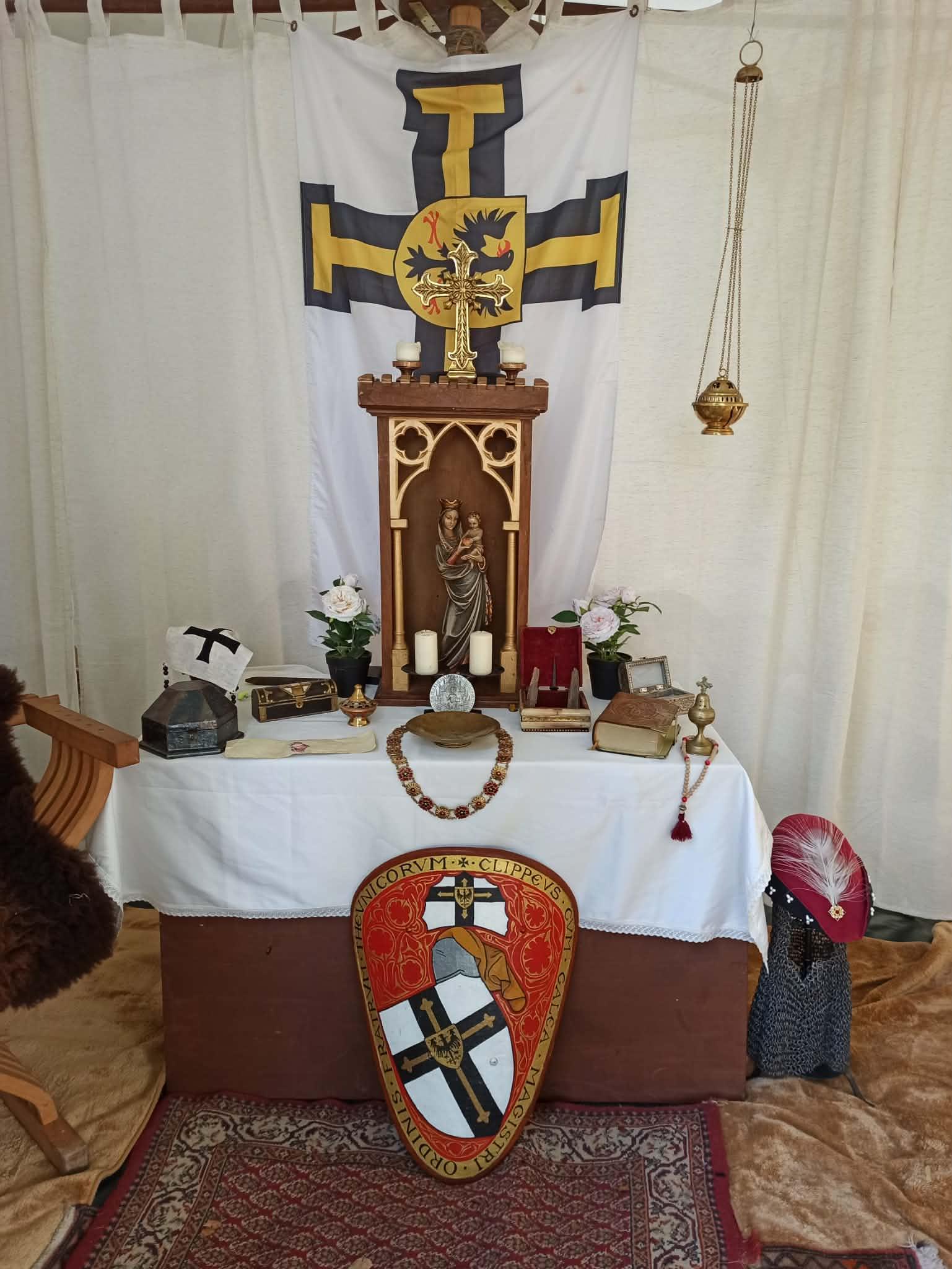 Unser Altar ist im Stil der Gotik gehalten. Die Heilige Jungfrau, die eine der zentralen Figuren der Verehrung im Deutschen Orden ist, wird durch ein bewehrtes Haus geschützt. Talglampen und Weihrauchgefäße runden das Bild ab.