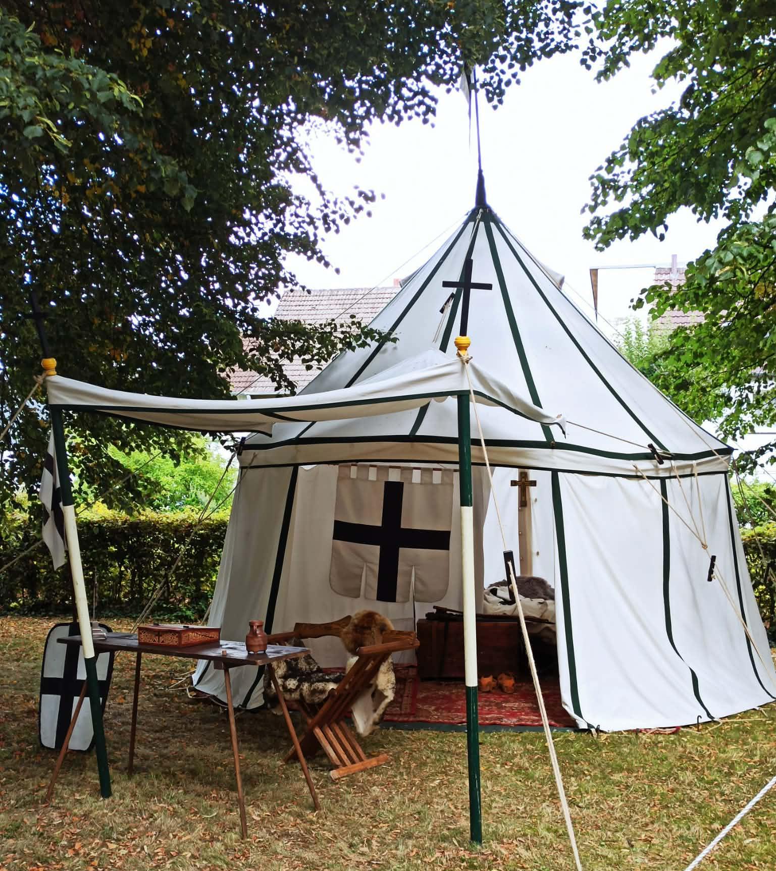 Zu den bekanntesten Zelten des Mittelalters gehören Speichenradzelte. Sie waren ab Beginn des Hochmittelalters bis weit in die Renaissance hinein in Gebrauch. Dieses Speichenradzelt besteht aus mehreren Teilen und ist rund 350 cm hoch. Die Grundfläche beträgt ca. 4,5 m im Durchmesser und wird durch 16 Stangen in seiner fast runden Form gehalten. Das dreieckige Vordach hat eine ungefähre Größe von ca. 5x3 m. Es dient als Wohnzelt des Komturs innerhalb des Lagers.
