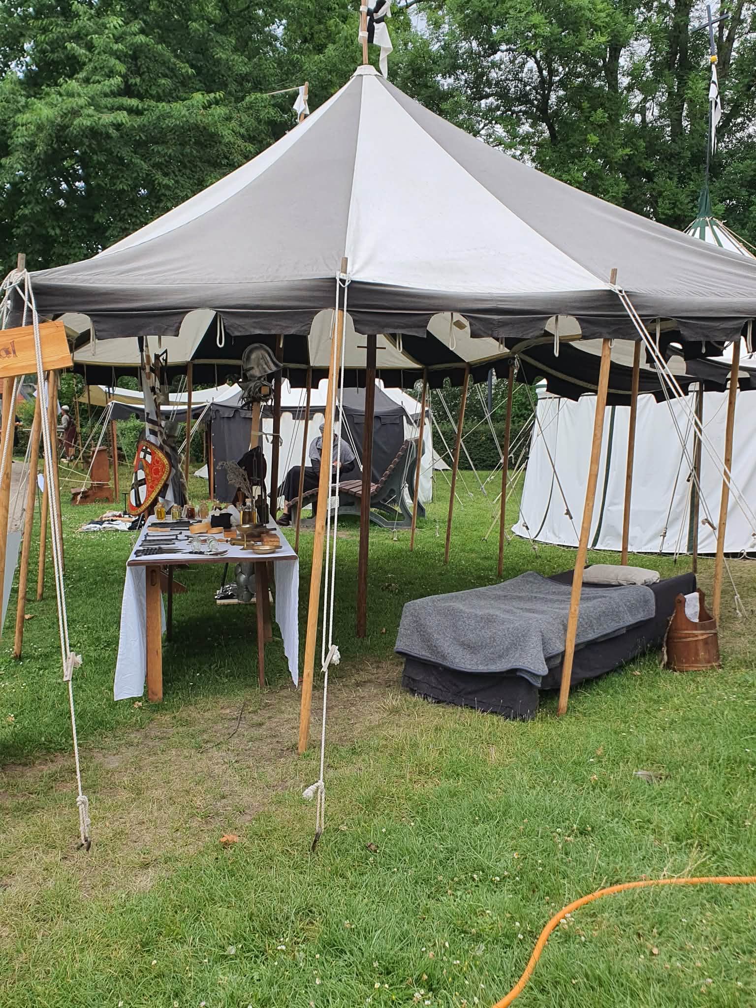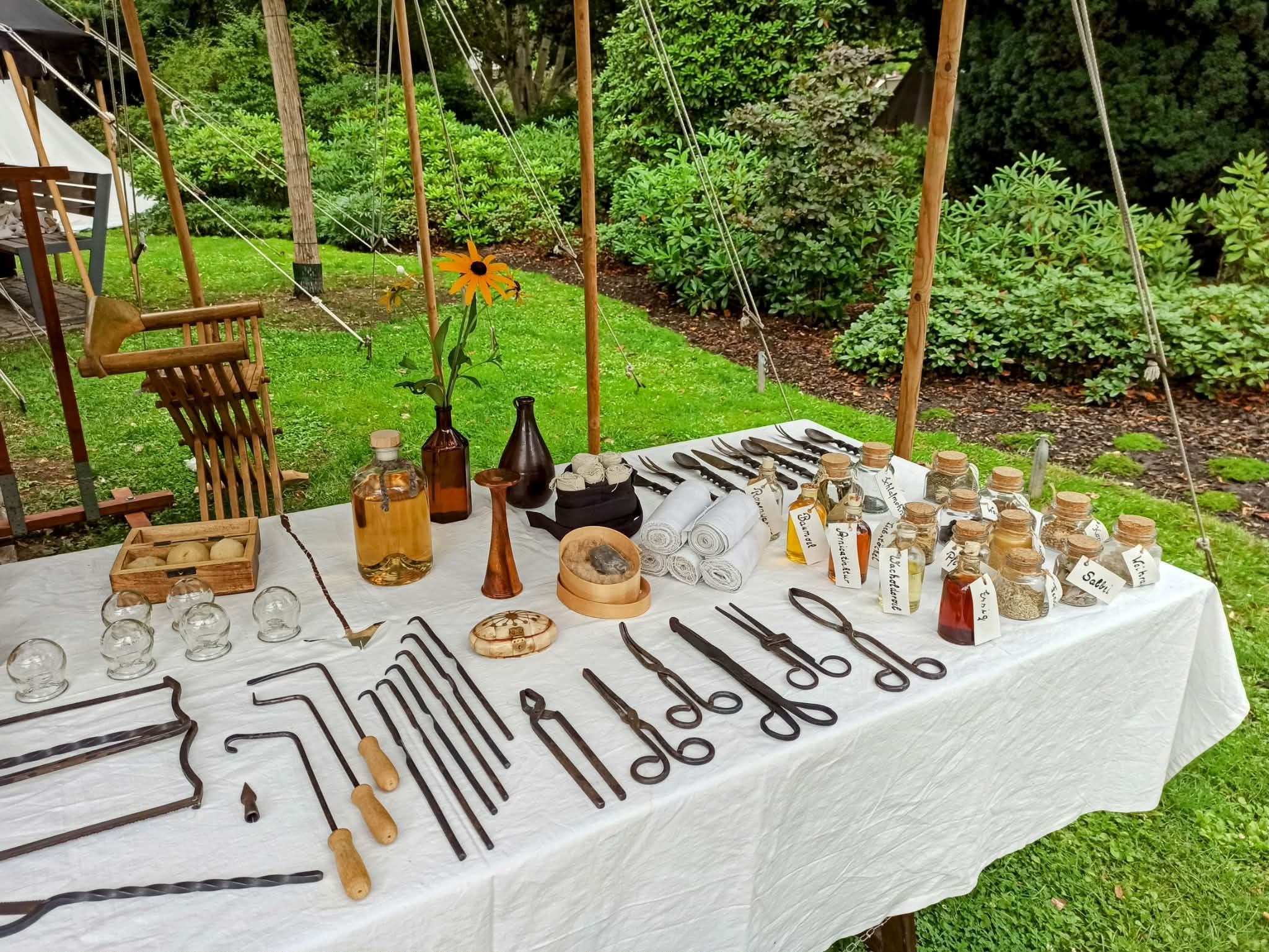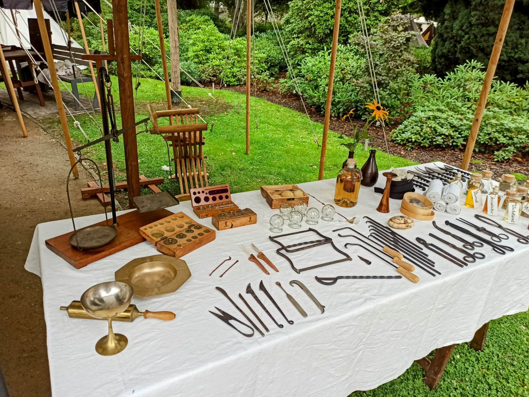 Hier ist noch ein Überblick über die Apotheke (ganz rechts) und den chirurgischen Instrumenten des Spitals. Zum Abmessen und Abwiegen der benötigten Kräuter und Mixturen steht ebenfalls eine historische Apothekerwaage zur Verfügung. In der Apotheke sind bereits heilende Kräuter in Gefäße abgefüllt. Wir sind in der Lage, einen guten Überblick zu mittelalterlichen Behandlungsmethoden zu geben. Ein Teil unserer Mitglieder haben sich in ihrer Freizeit ausgiebig mit der mittelalterlichen Heilkunde beschäftigt und stehen dem Publikum gerne Rede und Antwort.