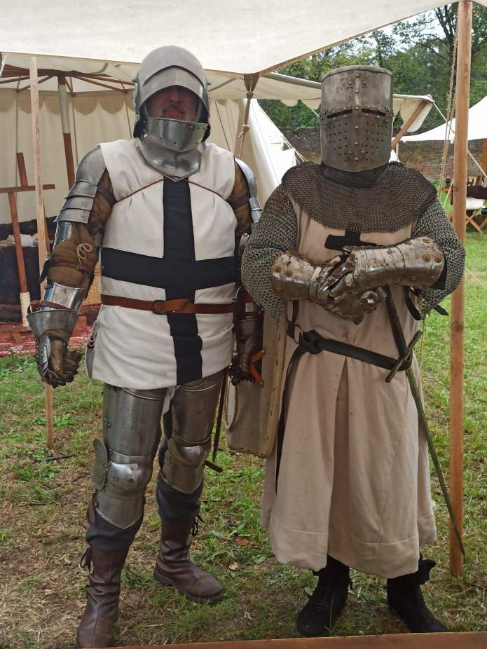 Hier sieht man den Entwicklungssprung der Rüstungen und Helme vom späten Hochmittelalter und zur Zeit des 13jährigen Krieges (links im Bild). Der hochmittelalterliche Ritter (rechts) trägt einen langen Waffenrock (ca. bis 1380), einen Topfhelm, eine Kettenhaube und einen Ringelpanzer, einzig die von ihm getragenen Plattenhandschuhe kommen erst zur Zeit der Burgunderkriege ab 1480 auf. Die linke Darstellung zeigt einen Ordensritter zur Zeit des 13jährigen Krieges (1454 – 1466). Hier sind schon erste Teile einer Plattenrüstung zu erkennen, wie Schultern, Glockenhandschuhe sowie Arm- und Beinzeug. Der zu dieser Zeit moderne Schaller wird durch eine feststehende Halsberge ergänzt, Ab spätestens 1390 verkürzt sich der Waffenrock und auch der darunter getragene Gambeson. Der Plattenrock wurde ab 1360 immer mehr durch die Brigantine abgelöst, die durch die durch-gehend miteinander vernieteten Metallreifen günstiger herzustellen war und einen besseren Schutz des Körpers versprach.