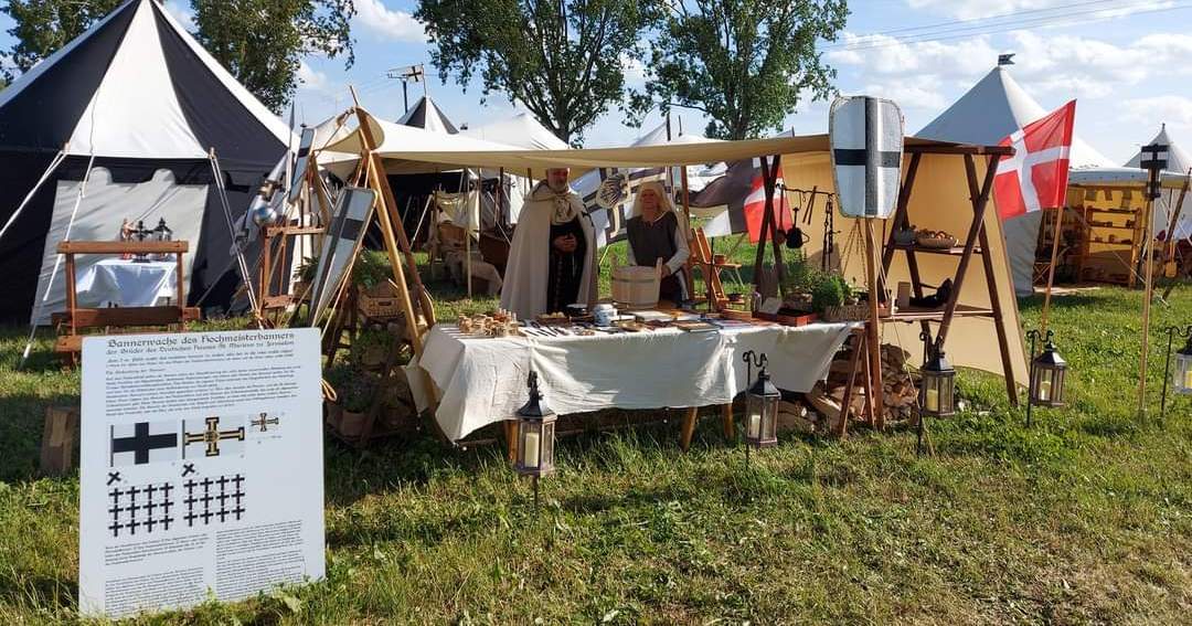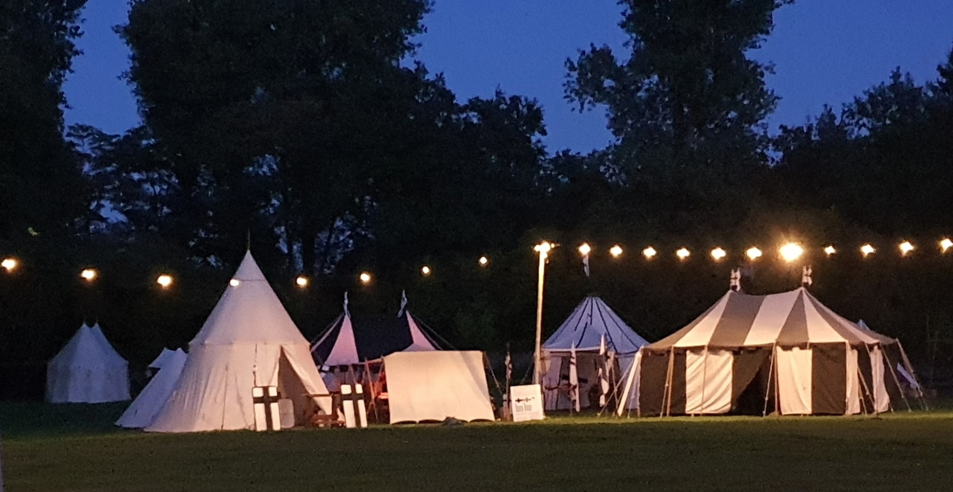 Das Lager der Bannerwache besteht insgesamt aus einem Speichenradzelt rund 4,5m mit Vordach, zwei Zweimaster schwarz/weiß 6x4m mit Vordach, von denen eines als Gemeinschaftszelt mit Sitzgruppe und das andere als Präsentationszelt ausgelegt ist, einen Zweimaster 4x6m weiß als Wohnzelt, ein Zweimaster Sachs 6x4m als Vorratszelt, ein Keilzelt 5m, zwei Keilzelte rund 4m, zwei Keilzelte rund 3,5m und einem weiteren Speichenrad 6m weiß als Kirchenzelt. Außerdem haben wir verschiedene Sonnensegel in den Größen 7x3m, 3x2m und 4x2m, womit wir das Lager an die individuellen Größenverhältnisse der Veranstaltung anpassen können.