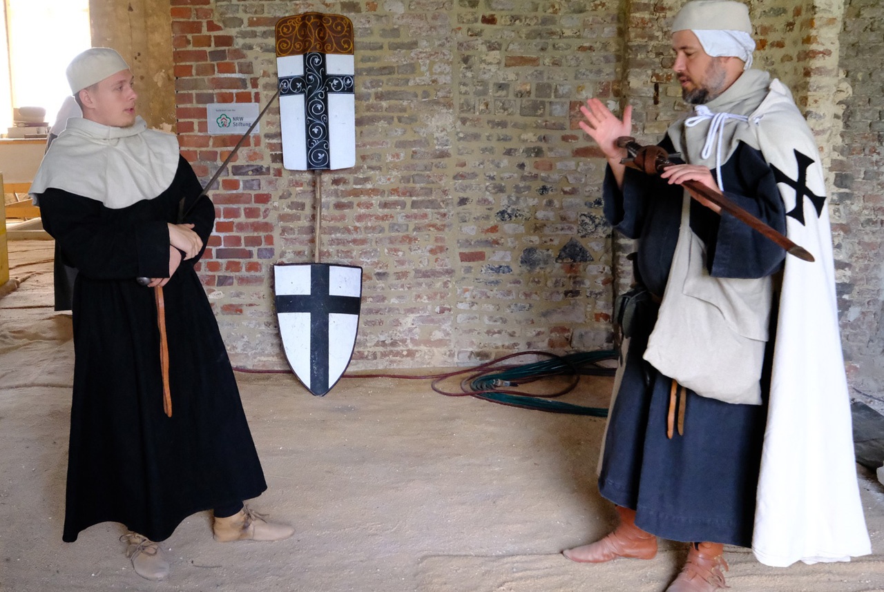 Bruder Timotheus (links im Bild) ist vor kurzem in die Bannerwache eingetreten und durchläuft nun alles, was ein Ritterbruder bis zu seiner Weihe an Fertigkeiten und Wissen erlernen muss. Hier erklärt ihm Waffenmeister Patricius die Handhabung des Schwertes.