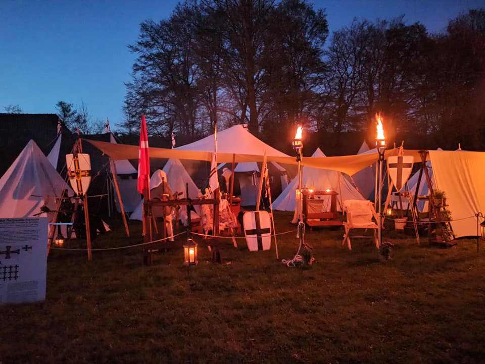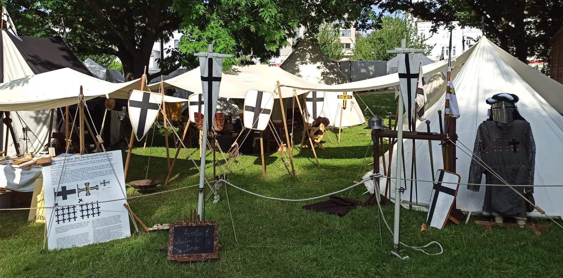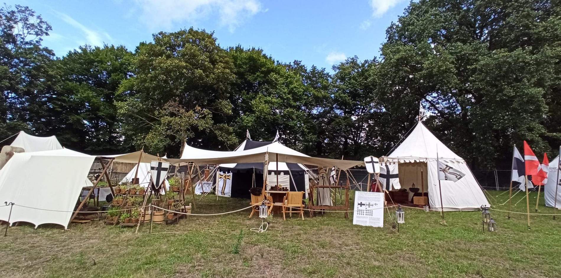 Das Lager der Bannerwache besteht insgesamt aus einem Speichenradzelt rund 4,5m mit Vordach, zwei Zweimaster schwarz/weiß 6x4m mit Vordach, von denen eines als Gemeinschaftszelt mit Sitzgruppe und das andere als Präsentationszelt ausgelegt ist, einen Zweimaster 4x6m weiß als Wohnzelt, ein Zweimaster Sachs 6x4m als Vorratszelt, ein Keilzelt 5m, zwei Keilzelte rund 4m, zwei Keilzelte rund 3,5m und einem weiteren Speichenrad 6m weiß als Kirchenzelt. Außerdem haben wir verschiedene Sonnensegel in den Größen 7x3m, 3x2m und 4x2m, womit wir das Lager an die individuellen Größenverhältnisse der Veranstaltung anpassen können.